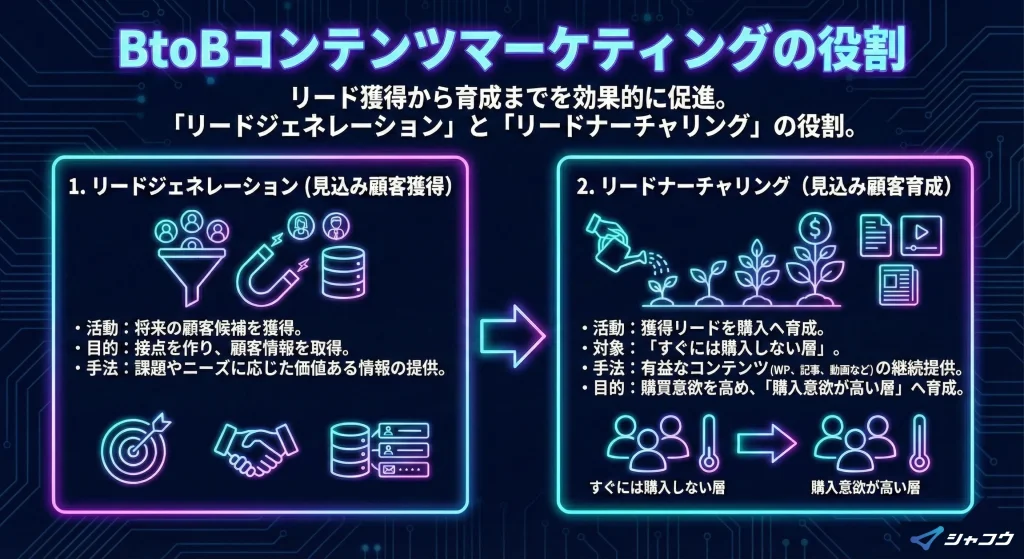 ・コンテンツはリード獲得(ジェネレーション)と育成(ナーチャリング)の両方を支える