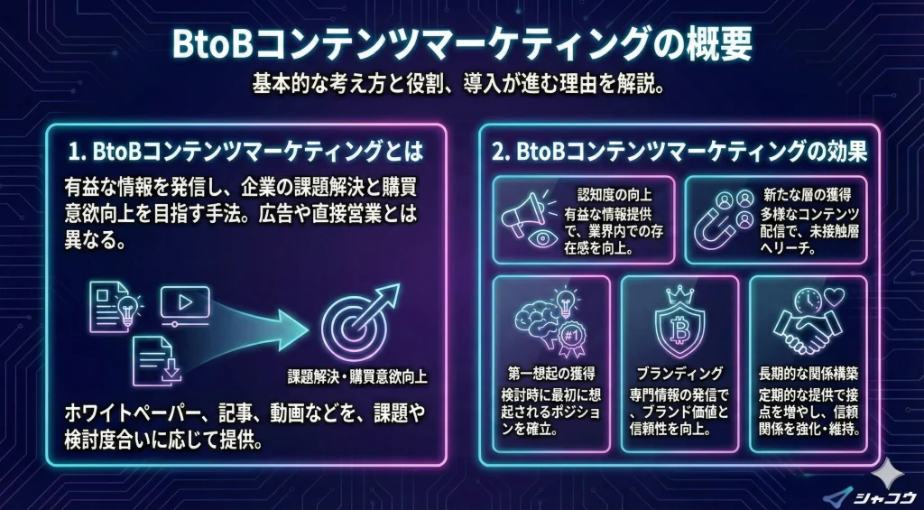 この章では、BtoBコンテンツマーケティングの基本的な考え方と役割を整理し、なぜ多くのBtoB企業で活用が進んでいるのかを解説します。