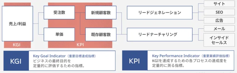 • KGI:最終的に達成したい状態を示す数値(売上目標、顧客単価、Webサイト流入数など)