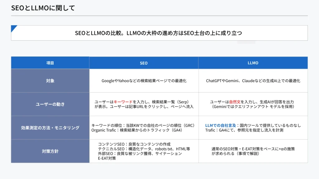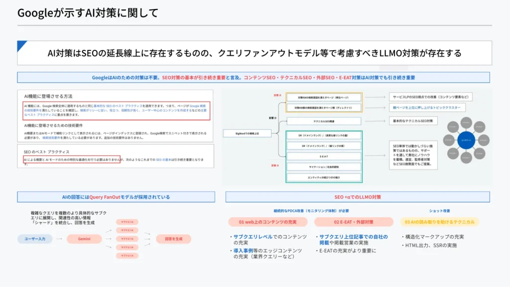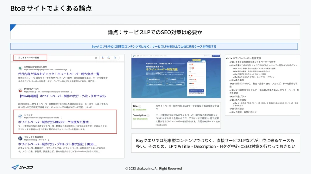 基本的に必要です。サービスLPはBuyクエリ(購入・検討に近い検索)を担うため、タイトル・ディスクリプション・構造化など最低限の対策は行いましょう。