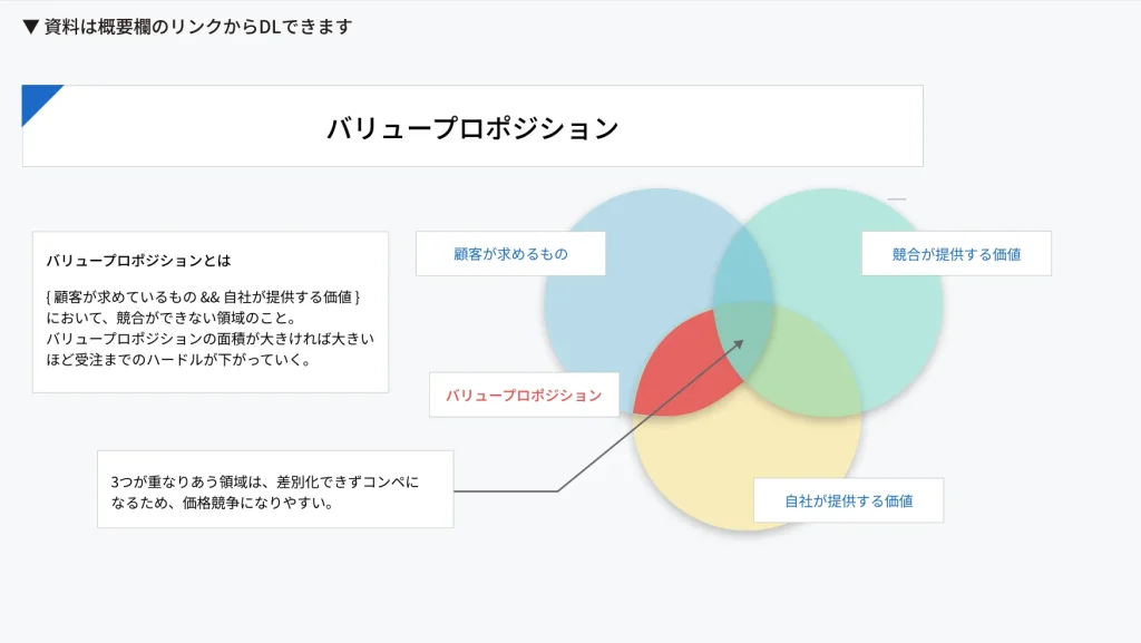 バリュープロポジションは、「顧客が求める価値」「自社が提供できる価値」「競合が提供する価値」この3点の重なりをどう設計するか、という考え方です。