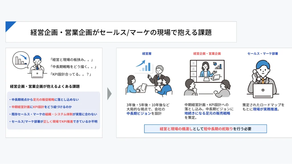 経営企画の最大の使命は、企業価値向上という中長期ビジョンを、事業戦略として具体化し、現場のマーケティング・セールスに接続することです。中期経営計画が数字だけで終わり、販売戦略やKPIに落ちていなければ、計画は実行されません。