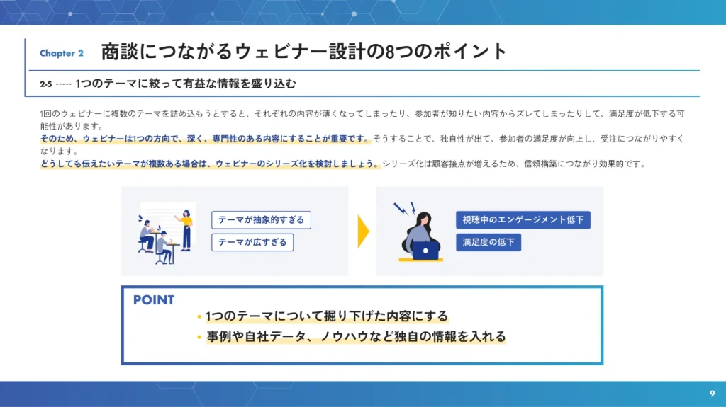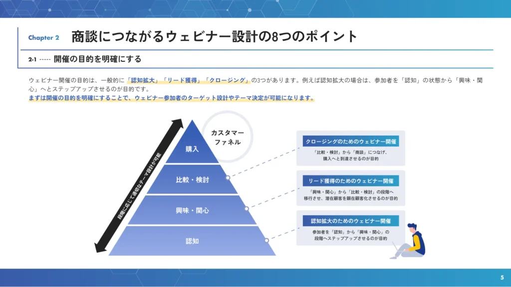 BtoBでは、情緒的な表現よりも、機能的価値やベネフィットを筋道立てて伝えることが重視されます。加えて、意思決定に伴う失敗不安を和らげるための信頼性や権威性も欠かせません。