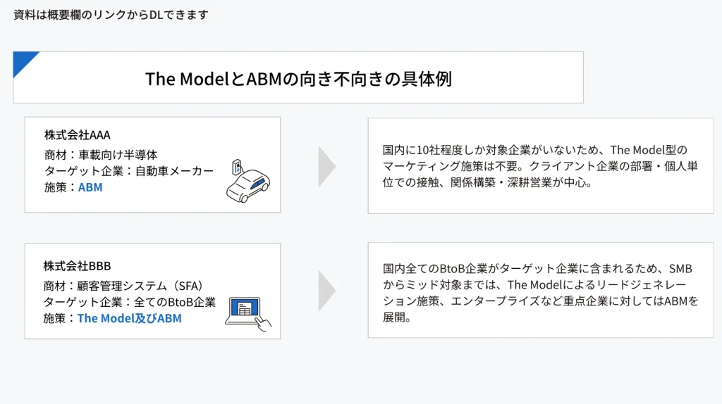 まず押さえておくべきなのが、BtoBマーケ・セールスの上流概念として知られる「The Model」と「ABM」という2つの考え方です。
