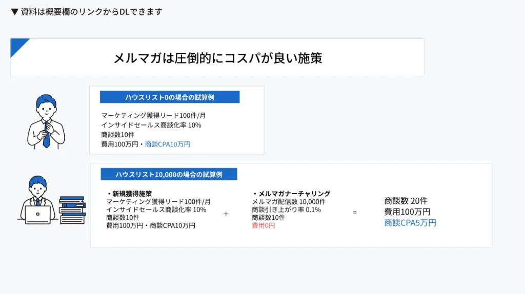 特にメルマガは広告費をかけずに実施できるため、良質かつ大規模なハウスリストは極めて強力な武器になります。