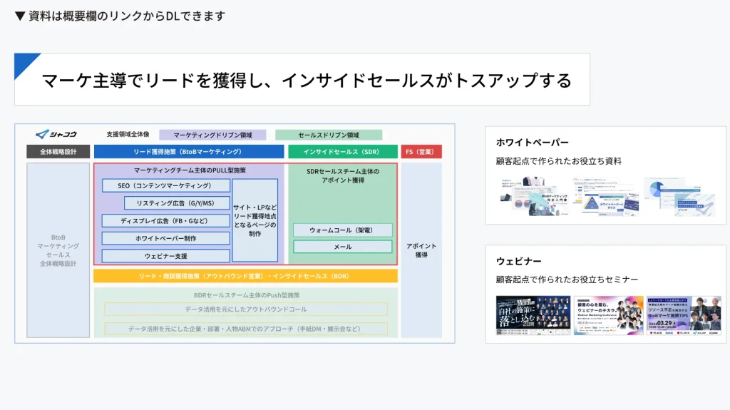 シャコウでは、SEOや広告、ホワイトペーパーといった施策単位の支援にとどまらず、経営企画・営業企画の視点から、事業成長につながるマーケティング・セールスの全体設計と推進を支援しています。