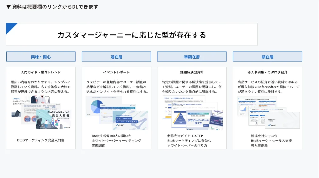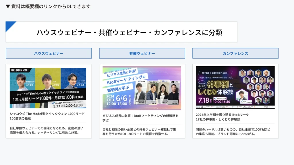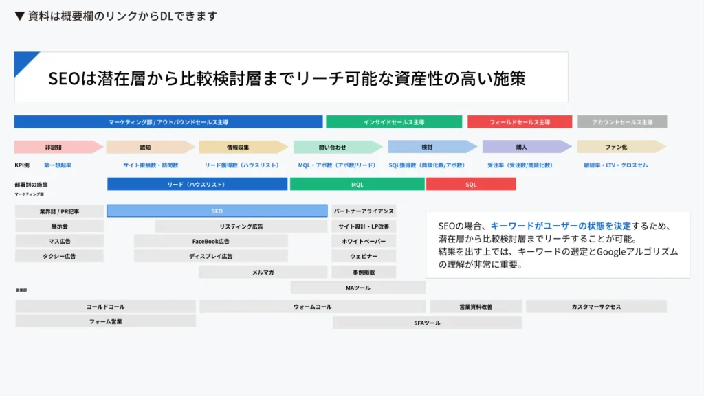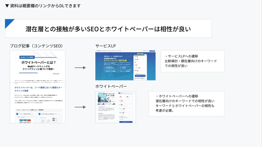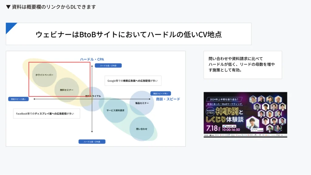 - ホワイトペーパー、SEO、広告、ウェビナーなどの施策と相性が良い