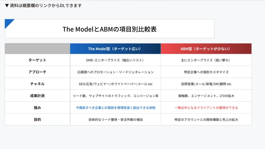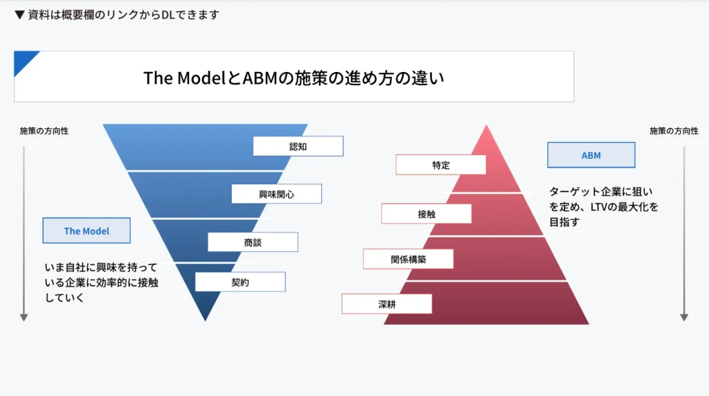 The ModelとABMは、いずれも商談・受注を生み出すための営業・マーケティング手法ですが、前提となる考え方とアプローチの方向性が大きく異なります。