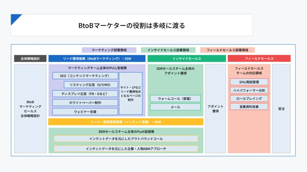 BtoBマーケティングの現場では、「SDR」「BDR」「インサイドセールス」「ホワイトペーパー」など、多くの専門用語や施策が登場します。しかし、それらを場当たり的に組み合わせるだけでは、安定して成果を出し続けることはできません。