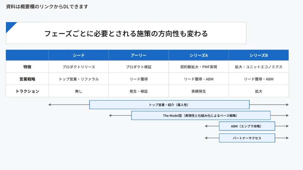 ここまで説明すると、The ModelとABMは対立する概念のように見えるかもしれません。しかし、実際のBtoB企業では両者が併存するケースが大半です。一般的な成長フェーズごとの整理は以下の通りです。