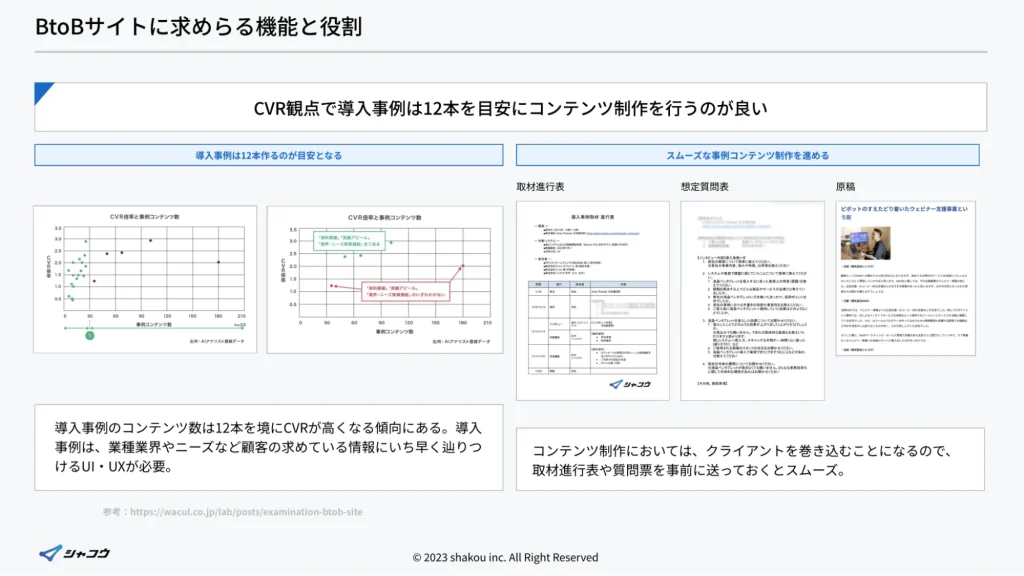 一定数(目安として10本以上)の事例が揃うと、CVRが安定・向上しやすくなります。業界・規模・用途のバリエーションを意識して蓄積していくことが重要です。