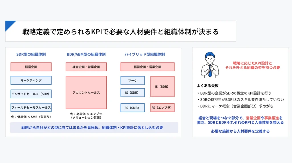 BtoBマーケ・セールスは、SDR型なのか、BDR/ABM型なのかで、必要なKPIも人材要件も大きく変わります。戦略が曖昧なままでは、適切なKPI設計も組織設計もできません。