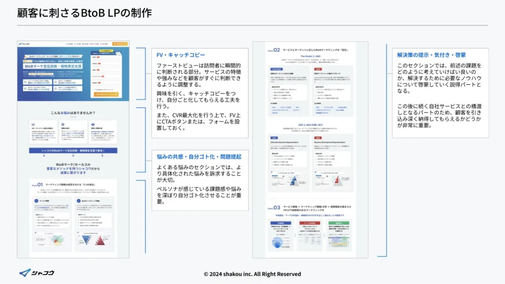 顧客に刺さるLPは、いきなりサービス説明から始めません。まずはキャッチコピーやファーストビューで興味を喚起し、次に悩みや課題への共感を通じて自分ごと化を促します。その上で、課題に対する考え方や解決アプローチを提示し、納得感を高めたうえで、自社サービスの特徴や提供価値を説明していく流れが基本となります。