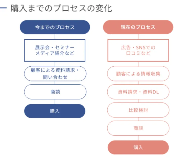 以前は対面での営業活動によって商品やサービスを購入してもらう流れが一般的でした。しかし、今は簡単に個人が情報にアクセスできる時代になり、購買プロセスも大きく変化しています。