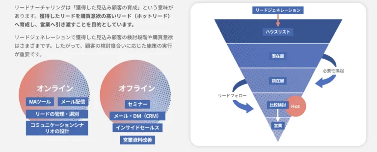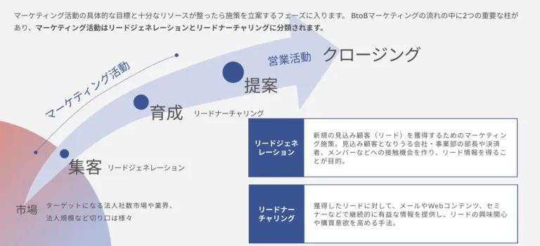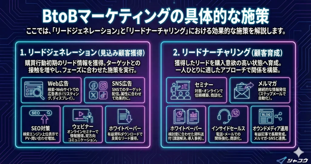 ここでは、「リードジェネレーション」と「リードナーチャリング」における効果的な施策を解説します。