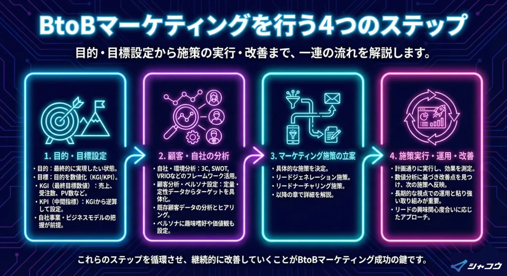 BtoBマーケティングのステップは、大きく4つに分けられます。