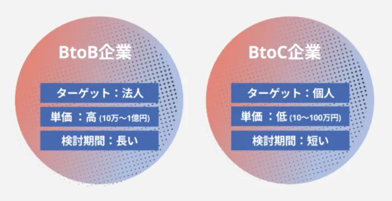 同じマーケティングでも、BtoBかBtoCかによってターゲットやニーズ、購入に至るまでの時間、金額の相場などが変わるため、それぞれの特徴を把握しておくことが重要です。