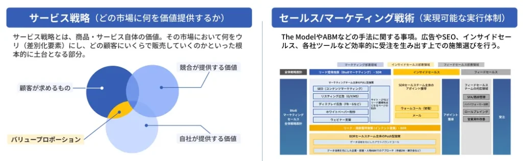 BtoBマーケティングは「サービス戦略」と「マーケティング戦略」から構成されています。サービス戦略とは、商品・サービス自体の価値を指します。市場における他社との差別化要素が土台です。