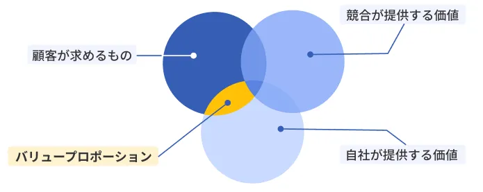 サービス戦略を考える際には、自社のバリュープロポジションを把握する必要があります。バリュープロポジションとは、「顧客が求めているもの」と「自社が提供する価値」において、競合ができない領域を指します。 バリュープロポジションの面積が大きければ大きいほど、受注までのハードルが下がるという特徴があります。