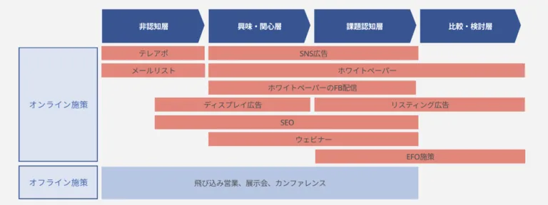 ・代表的施策(広告・SEO・ウェビナー・ホワイトペーパー・メール等)を組み合わせて成果を高める