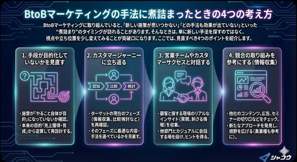 BtoBマーケティングに取り組んでいると、「新しい施策が思いつかない」「どの手法も効果が出ていない」といった“煮詰まり”のタイミングが訪れることがあります。そんなときは、単に新しい手法を探すのではなく、視点や立ち位置を少し変えてみることが突破口になります。ここでは、見直すべき4つのポイントを紹介します。