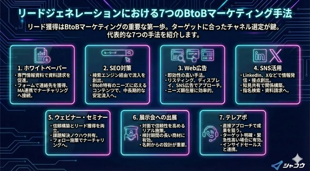 ・リード獲得には、SEO・広告・ホワイトペーパー・ウェビナーなどの施策がある