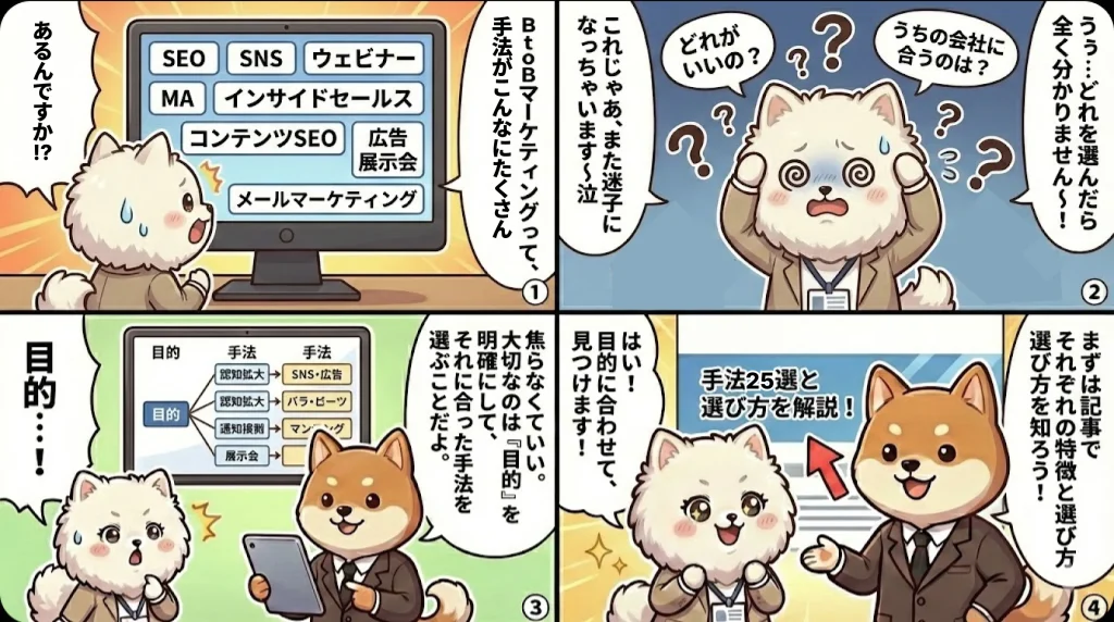BtoBマーケティングは、「手法ありき」ではなく、目的や顧客フェーズに応じて最適な施策を選び、組み合わせていくことが成果につながります。