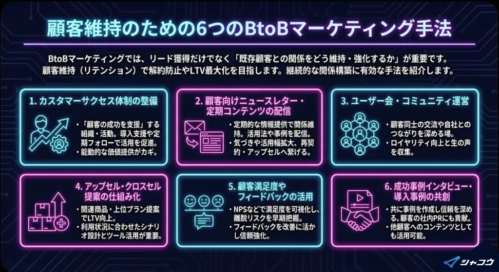 BtoBマーケティングでは、リード獲得や商談化だけでなく、「既存顧客との関係をどう維持・強化していくか」が重要なテーマです。顧客維持(リテンション)に取り組むことで、解約防止やLTV(顧客生涯価値)の最大化につながります。ここでは、継続的な関係構築に有効な手法を紹介します。