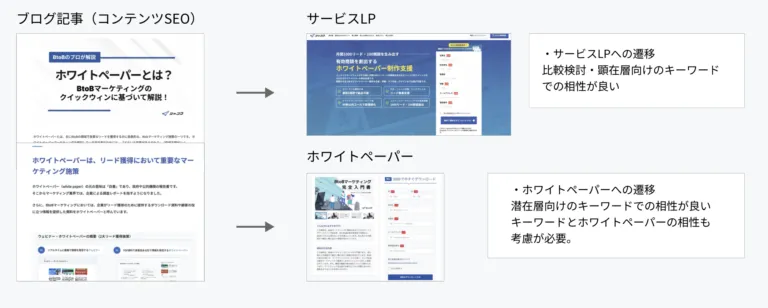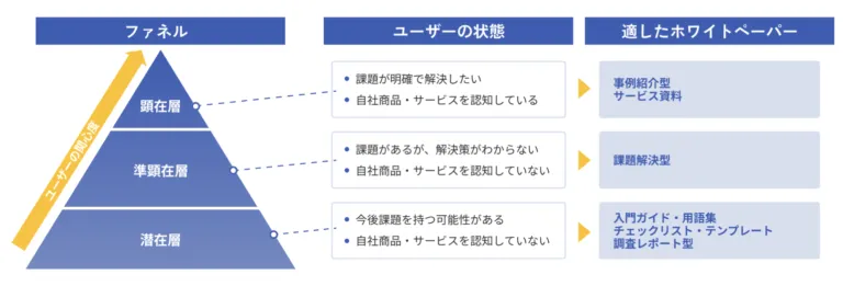 例えばホワイトペーパーを作成する場合、「顕在層」「準顕在層」「潜在層」のどの段階をターゲットにするかで作成すべき内容が異なります。