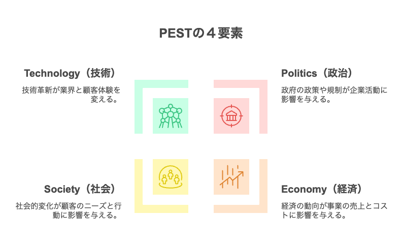 PEST分析は、マクロ環境(Politics/Economy/Society/Technology)の変化を捉えるフレームワークです。新規事業を考える際、思いつきや主観に頼らず、環境要因から論理的に着想を得ることができます。