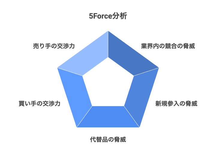 5Force分析は、マイケル・ポーターが提唱した業界分析フレームワークで、業界の収益性や競争状況を次の5つの力で捉えます。