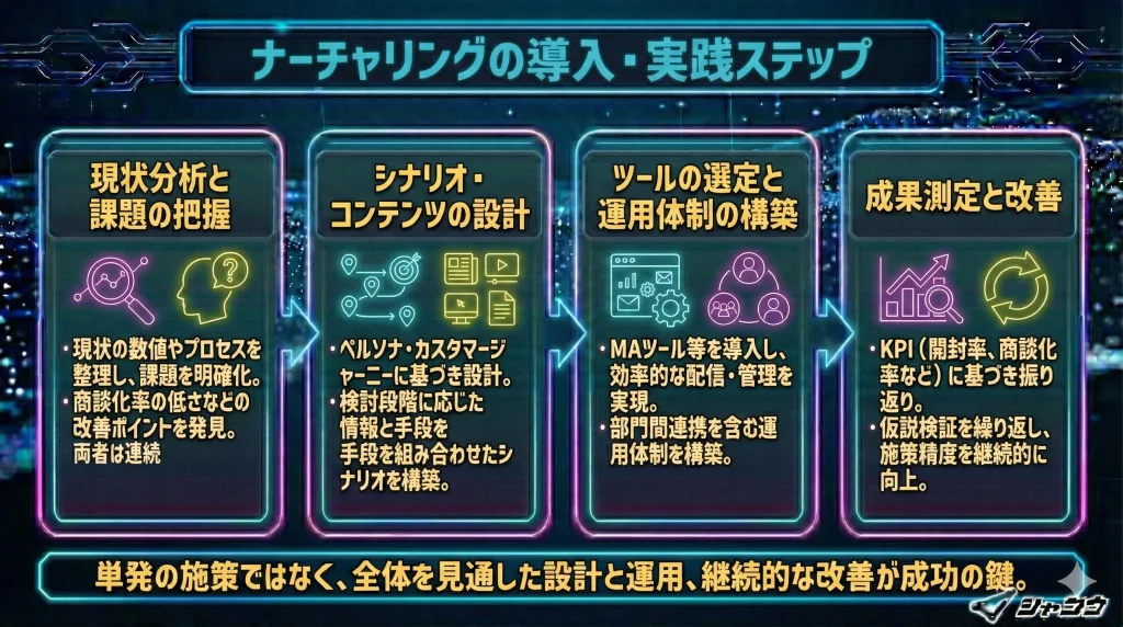 ナーチャリングを効果的に機能させるには、単発の施策ではなく、全体を見通した設計と運用が必要です。ここでは、導入から運用までの基本的なステップを4段階で解説します。