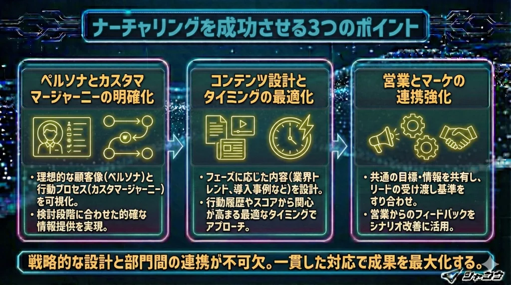 ナーチャリング施策は、ただ情報を届けるだけでは成果につながりません。リードの状態に応じて適切なアプローチを行うには、戦略的な設計と部門間の連携が欠かせません。ここでは、ナーチャリングを成功させるために押さえておきたい3つのポイントを紹介します。