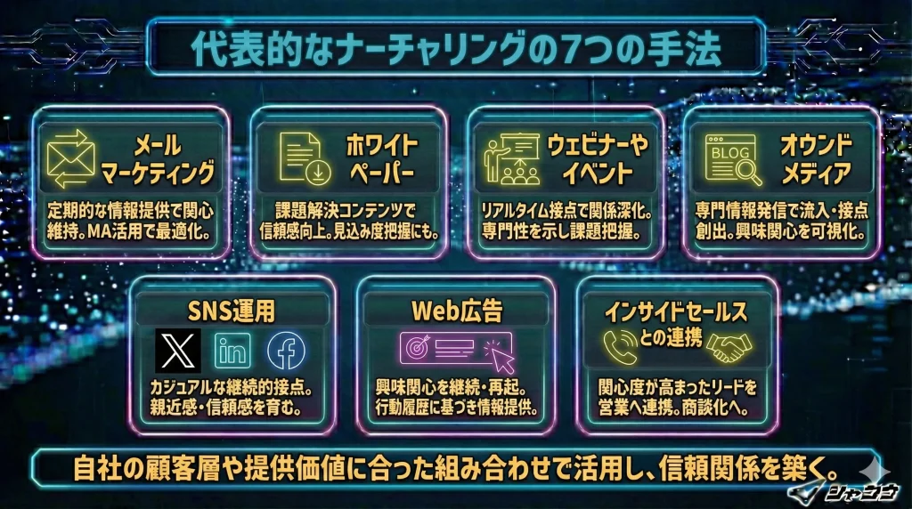 ナーチャリングは、リードと継続的な接点を持ち、信頼関係を築いていく活動です。ここでは代表的な7つの手法を紹介します。自社の顧客層や提供価値に合った組み合わせで活用しましょう。