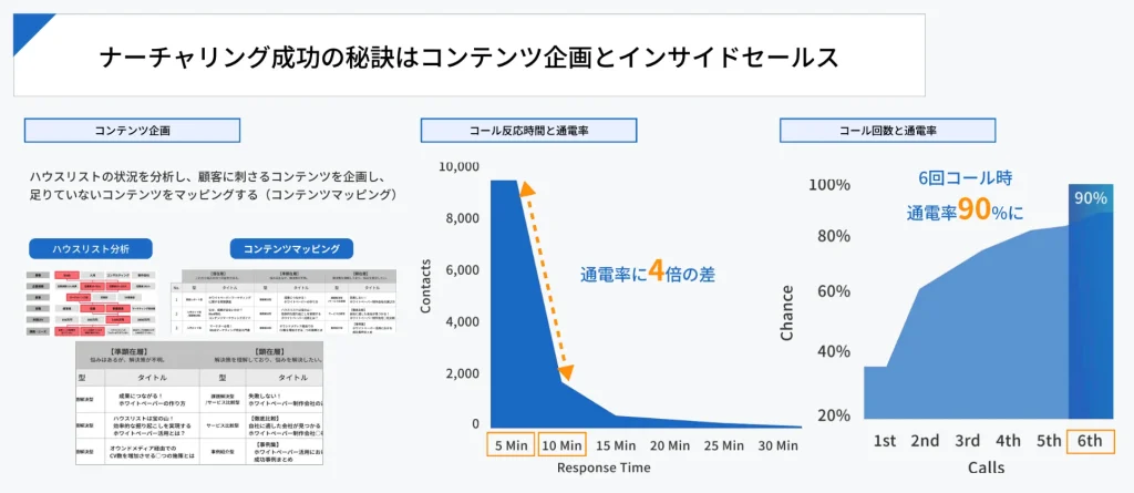 特に、反応直後にどれだけ早く電話やメールでフォローできるかは、通電率=その後の商談化に大きな影響を与える要素です。ナーチャリングは「育てて終わり」ではなく、営業チームと連携してこそ成果が生まれるという視点を忘れずに持ちましょう。