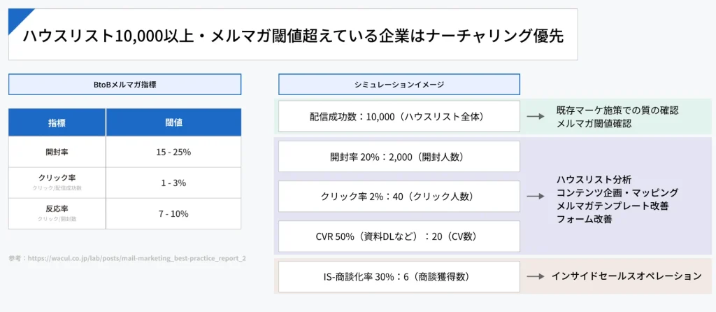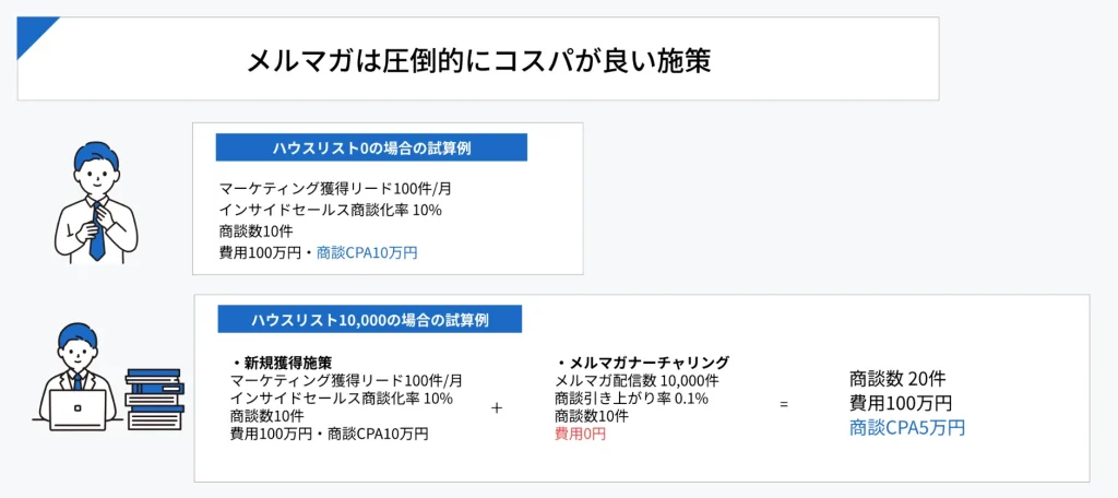 一方で、すでに保有しているハウスリストが1万件あれば、広告費をかけずに同数以上の商談を生み出すことも可能です。ターゲットの温度感に合わせて継続的に情報を届けられるという点で、ハウスリストは「顧客との資産」であり、ナーチャリング施策の成功を左右する土台になります。