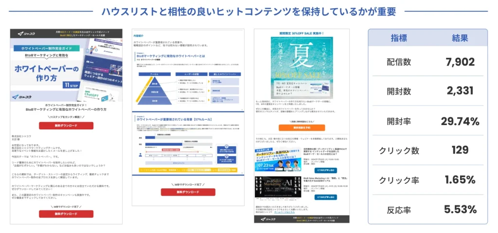 実際、シャコウで配信した「ホワイトペーパーの作り方」というメルマガは、ハウスリストとの相性が良く、開封率約30%、数百件のダウンロード、100件以上の商談創出に結びつきました。(詳細は次章で解説)
