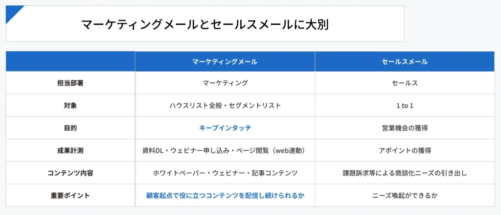 ナーチャリングの文脈では、マーケティングメールを中心に配信し、顧客が前向きになった段階でセールスメールを活用するという棲み分けが重要です。段階的に接点を増やし、無理のない形で行動を促す流れを意識しましょう。