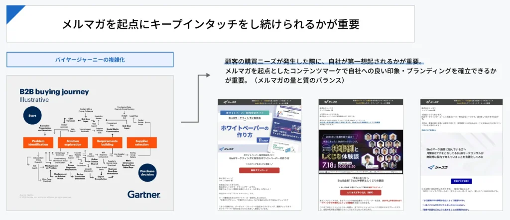 検討期間が長く、意思決定に複数の関係者が関わるBtoB商材では、リード獲得後の継続的なコミュニケーションが欠かせません。