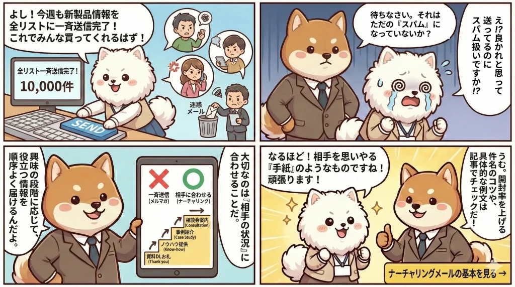 BtoBでは、リードの大半が「今すぐ導入を検討しているわけではない」状態です。このようなリードに対しては、売り込み色の強いメールはかえって逆効果になるケースがあります。