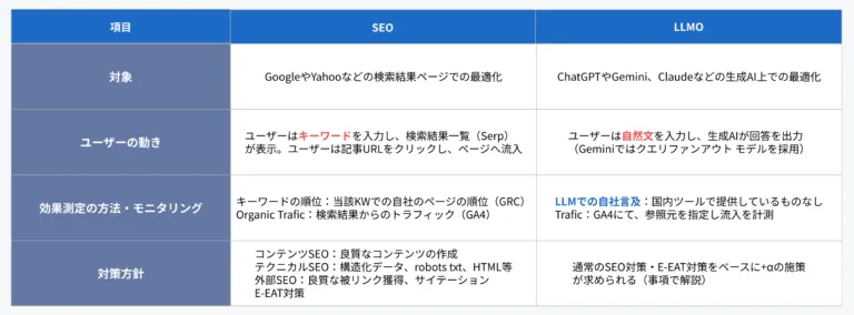 ・SEOが検索結果対策なのに対し、LLMOはAIの回答内で参照されることを狙う