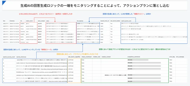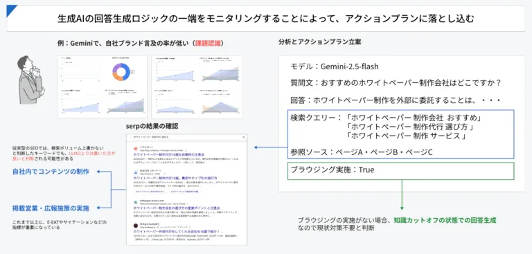 モニタリングの結果、自社が特定ジャンルのクエリで言及されない場合、その分野での認知獲得やエビデンスの補強施策を検討します。