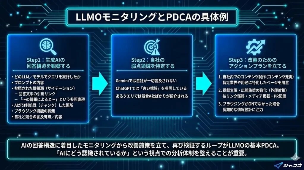 LLMOにおける最適化は「施策を打つこと」だけで完結するものではありません。生成AIがどのようなロジックで回答を生成しているかを観察し、その結果に応じて改善策を立てることが不可欠です。