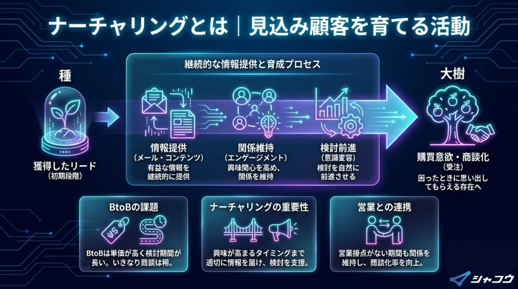 マーケティングにおける「ナーチャリング(nurturing)」とは、獲得したリード(見込み顧客)に対して継続的に有益な情報を提供し、購買意欲を高めていく活動を指します。