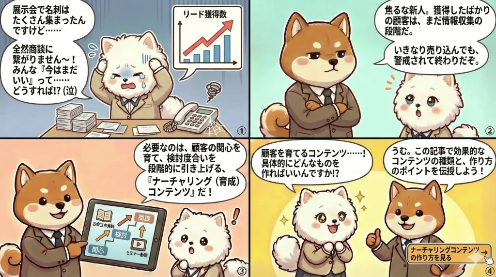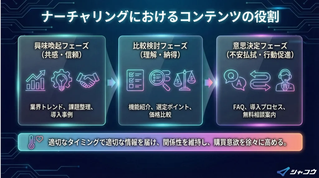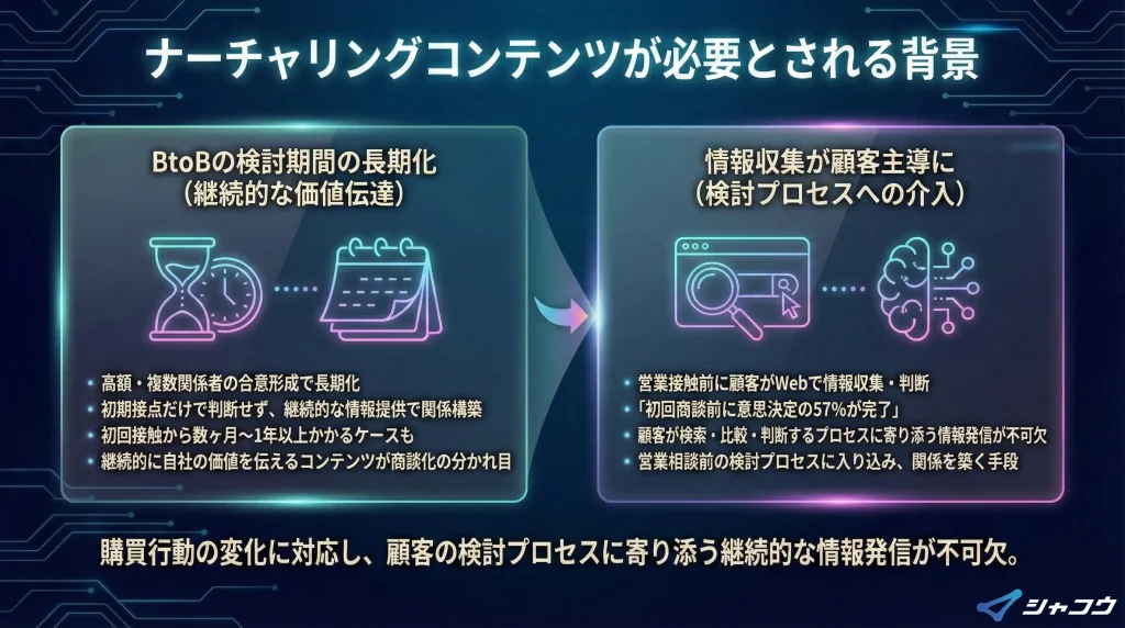 このような変化の中では、企業側から積極的にコンテンツを提供し、顧客が検索・比較・判断するプロセスに寄り添う情報発信が不可欠です。ナーチャリングコンテンツは、顧客が営業に相談する前の検討プロセスに入り込み、関係を築くための手段として機能します。