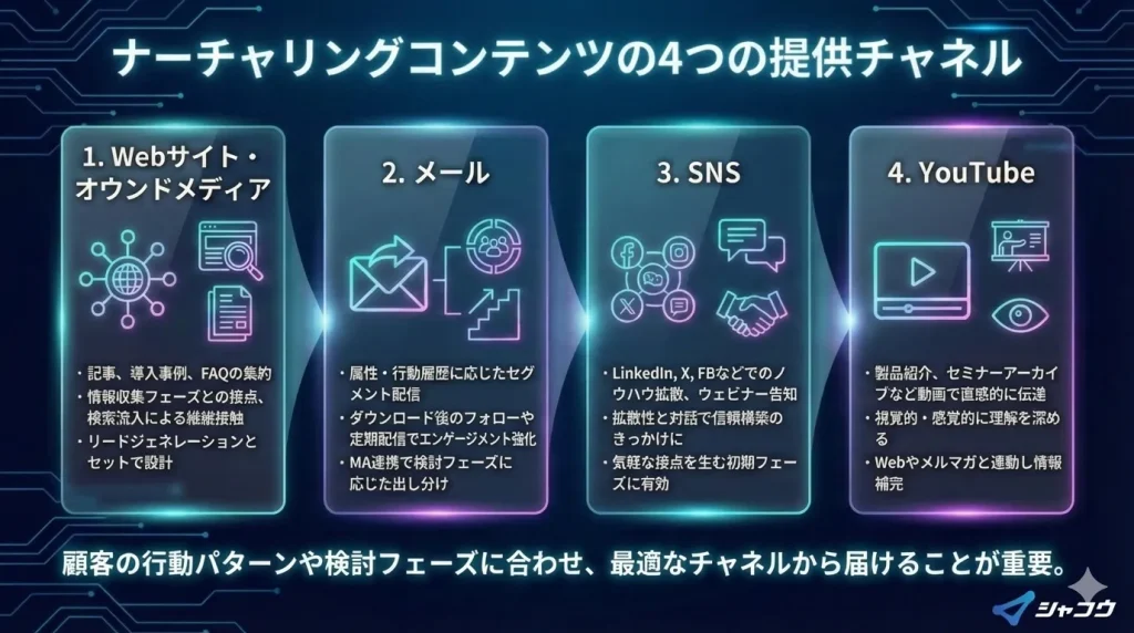 どれほど良いコンテンツを作っても、届け方が適切でなければ効果は半減します。ナーチャリングコンテンツは、顧客の行動パターンや検討フェーズに合わせて、最適なチャネルから届けることが重要です。ここでは、主な4つの提供チャネルについて解説します。