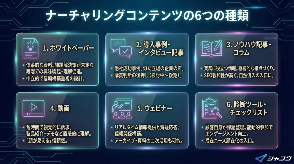 ナーチャリングにおいて活用されるコンテンツは多岐にわたりますが、大切なのは顧客の検討フェーズや関心に応じて、適切な情報を選び届けることです。ここでは、代表的なナーチャリングコンテンツの種類とその役割を紹介します。