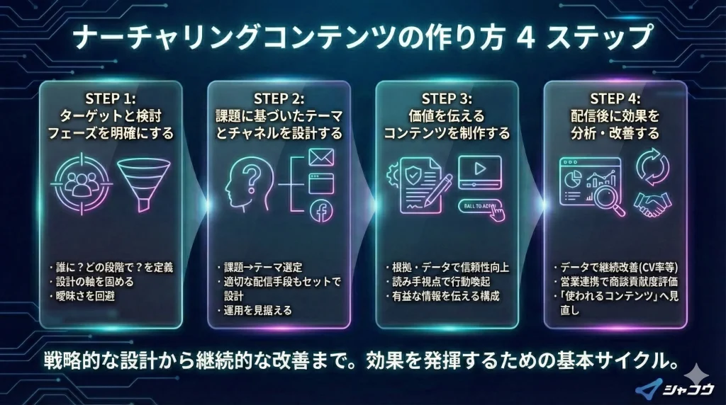 ナーチャリングコンテンツは、やみくもに作れば良いというものではありません。誰に・何を・どのように届けるかを戦略的に設計することで、はじめて効果を発揮します。ここでは、企画から配信・効果測定までの基本ステップを解説します。
