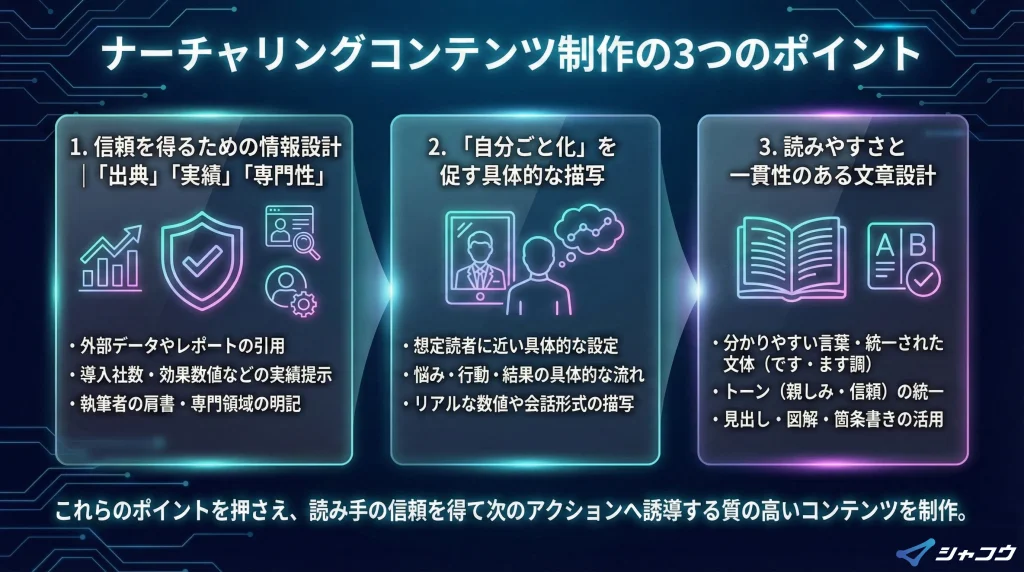 ナーチャリングコンテンツは、ただ情報を並べるだけでは成果に結びつきません。読み手の信頼を得て、次のアクションへ自然と誘導するためには、コンテンツそのものの「質」が重要です。ここでは、制作時に押さえておくべき3つの視点を紹介します。