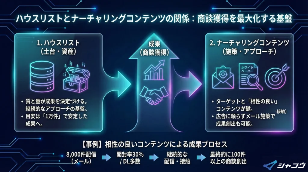 ナーチャリングの成果は、コンテンツの質だけでなく「誰に届けるか」によって大きく左右されます。つまり、ハウスリストの質と量が土台となり、施策の成否を決定づけるのです。ここでは、商談獲得の視点からハウスリストとナーチャリングコンテンツの関係を紐解き、成果を最大化するためのポイントを整理します。